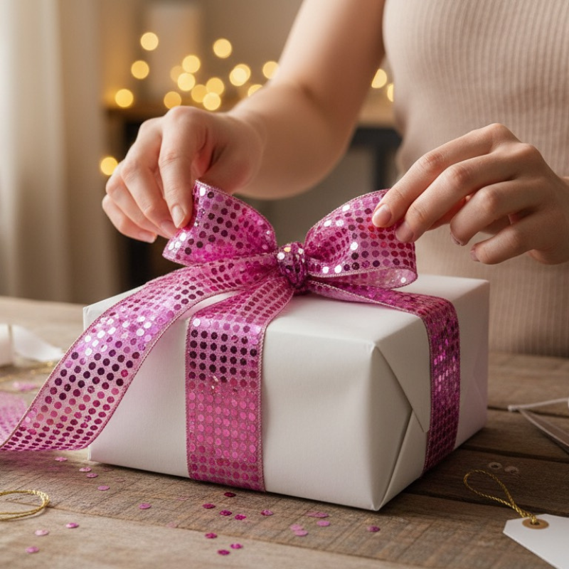 Glänzendes rosa Paillettenband mit Drahtkanten, das Charme und Struktur verleiht, ideal für anspruchsvolle Bastelprojekte.