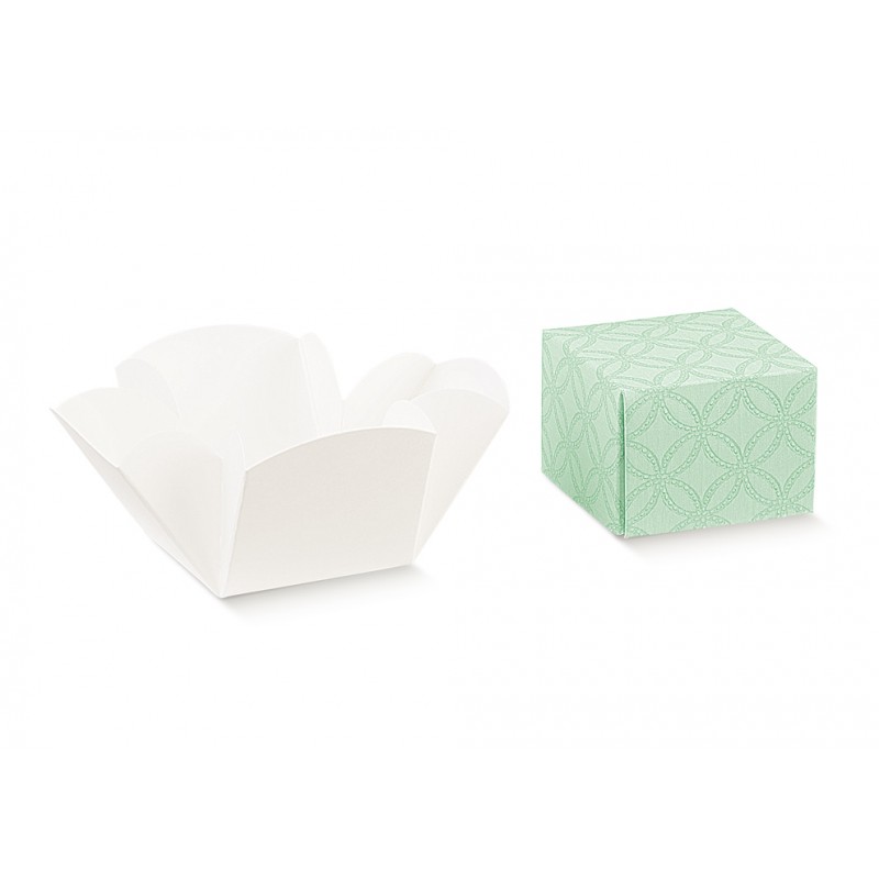 FLEUR Geschenkbox ohne Fenster, mit gestepptem Finish in hellgrün. Maße: 50x50x50mm. Perfekt für Pralinen, Süßigkeiten oder kleine Andenken.