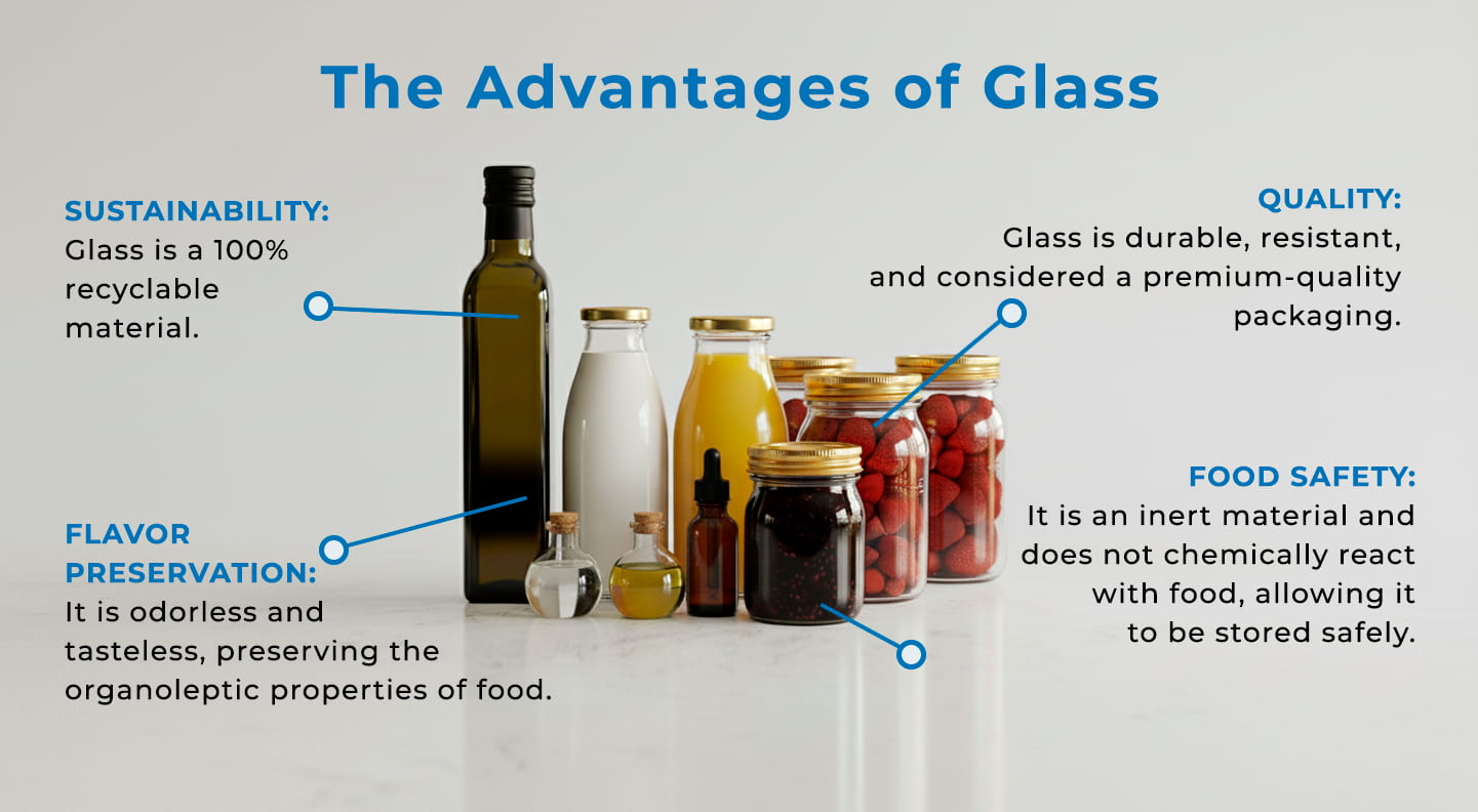 Odorless and tasteless, glass fully preserves the flavor, aroma, and properties of foods and beverages. Unlike other materials, it does not interfere with organoleptic properties, making it ideal for preserves, jams, sauces, beverages, and gourmet products.