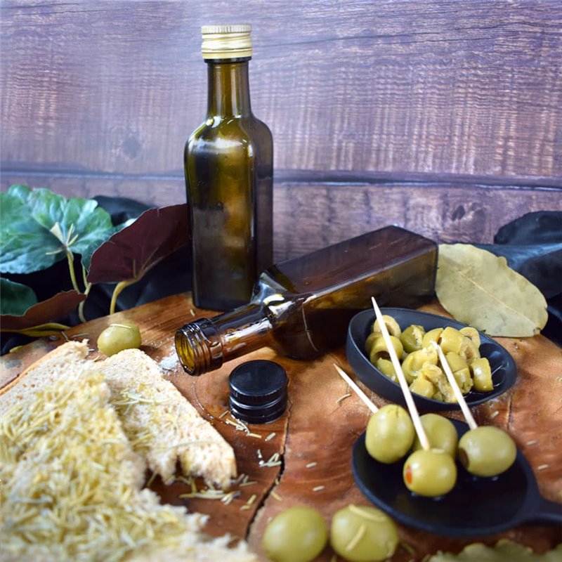 Orquidea dark glass bottle 100ml with gold cap, elegant and practical, ideal for oils, vinegars, alcoholic beverages, and sauces.
