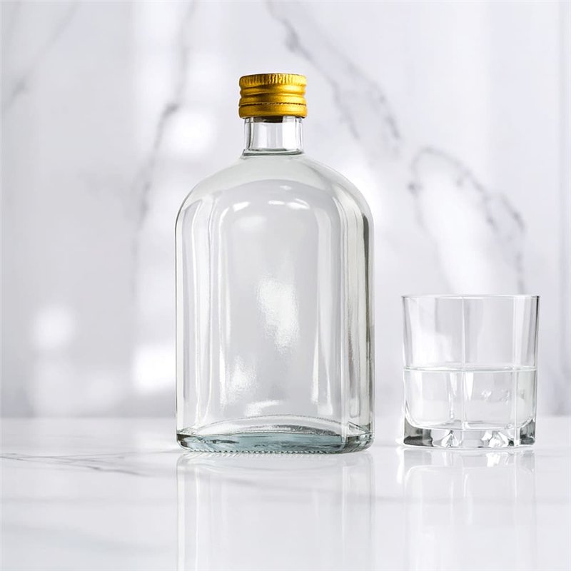 Glass bottle with 200ml capacity, pocket-style, for liqueurs and other spirits.