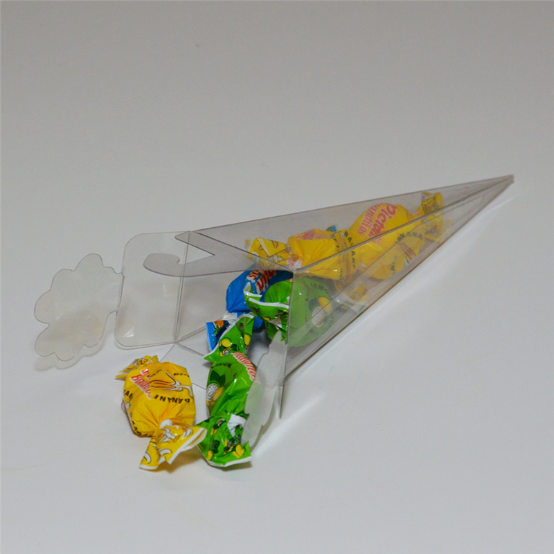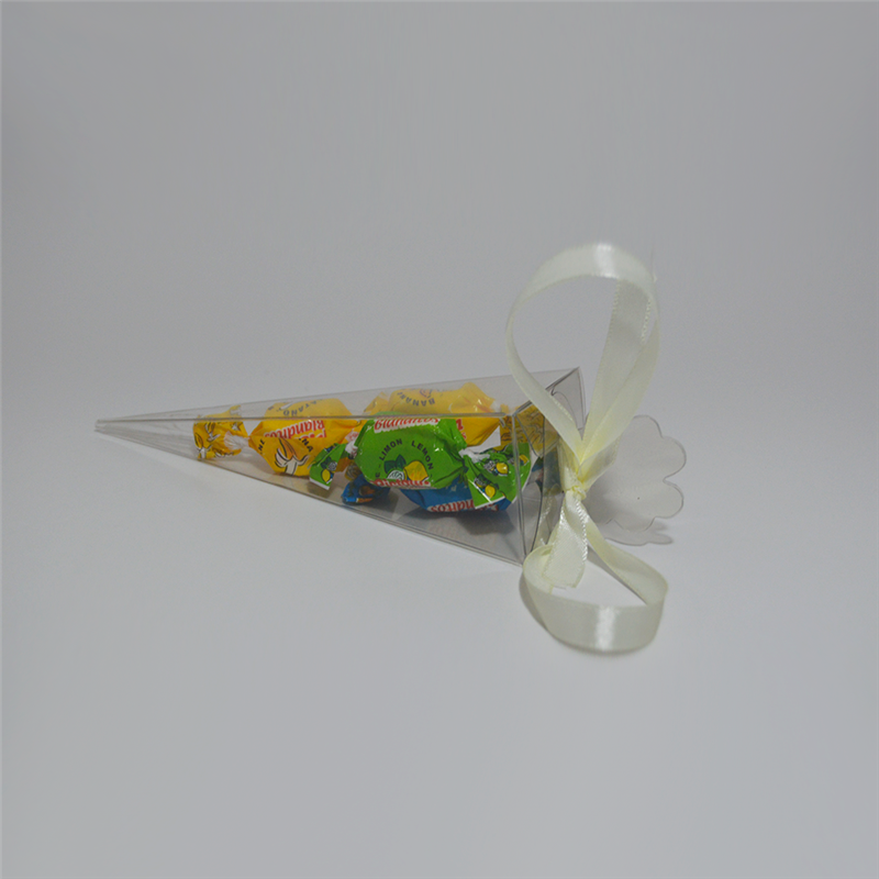 Clear PVC acetate box in cone shape. Ideal for chocolates, candies, and bakery products.