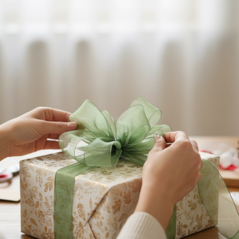 Green organza ribbon with internal wire, perfect for shaping elegant and creative forms in decorations and wrapping.
