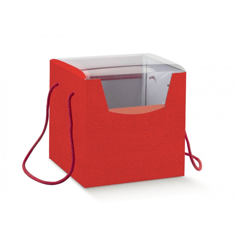 Gift Box - Lino Rosso 210X210X210mm features a crystal-clear acetate window and two 65cm organic cotton cords. Designed to showcase premium wines, gourmet hampers or luxury items without unwrapping. The 2mm triplex cardboard structure ensures durability, while the red linen finish adds sophisticated appeal.