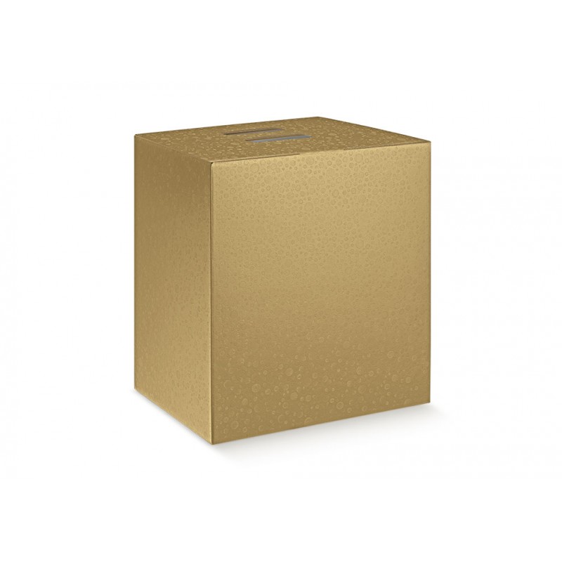 Gift Box - Cubotto 330X250X350 Sfere Oro is a sturdy, golden cardboard box designed to hold panettones (750g-1kg), bottles, and various products. Features upper holes that serve as handles for easy transport. Recommended weight: 2 to 6kg.