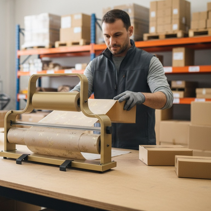 Sturdy gold wrapping paper dispenser for counters, ideal for fast packaging.