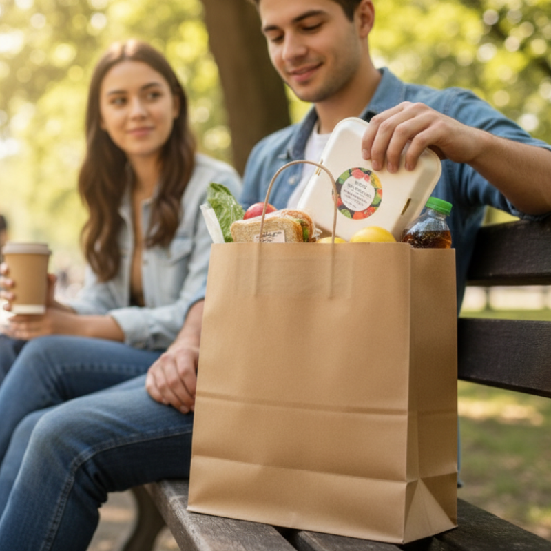 These bags are ideal for businesses seeking functional, durable, and personalized packaging for take away. Capacity to safely and efficiently hold food items.
