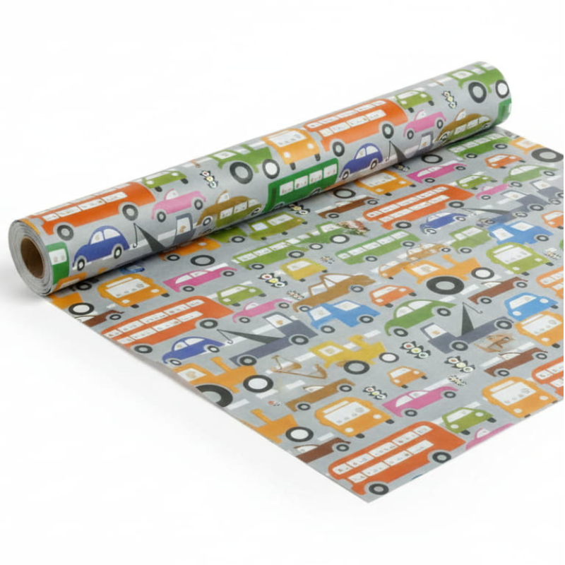 Colorful and playful kids' wrapping paper with a fun little cars print.