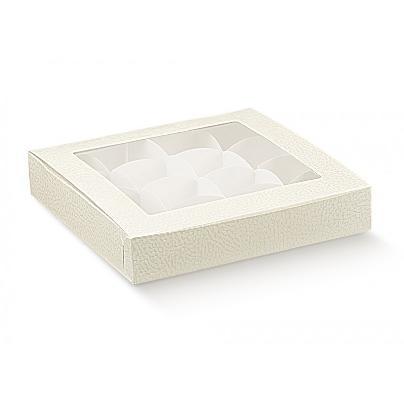Caja PRATICA con acabado en piel blanca, ventana transparente en la tapa e inserto interno para sujetar productos pequeños. Perfecta para bombones, regalos gourmet y recuerdos de eventos.