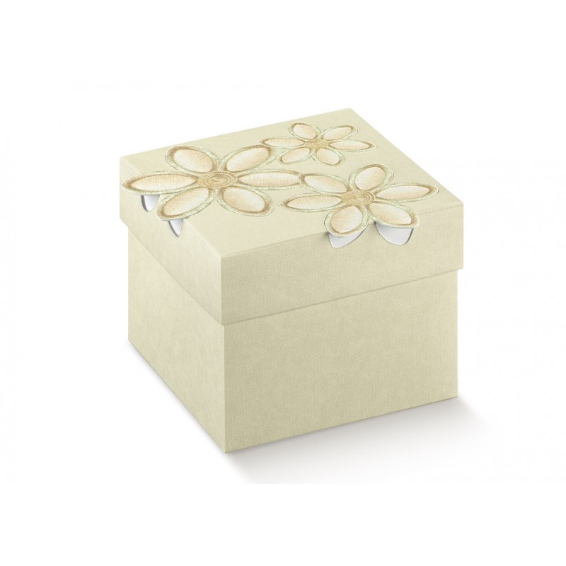 Caja elegante y resistente con flor bordada en la tapa, perfecta para regalos especiales.
