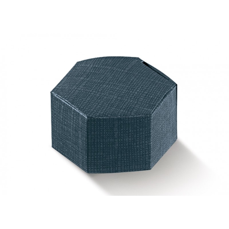 Caja para regalo - Esagono 60x30mm Juta Blu con diseño en forma hexagonal y acabado en yute azul. Perfecta para guardar detalles, dulces artesanales, productos naturales o pequeños objetos promocionales. Una opción original y elegante para presentar tus productos.