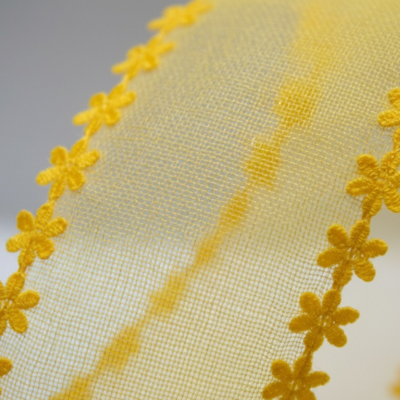 Cinta de organza amarilla con flores bordadas – elegante y vibrante para manualidades y decoración.