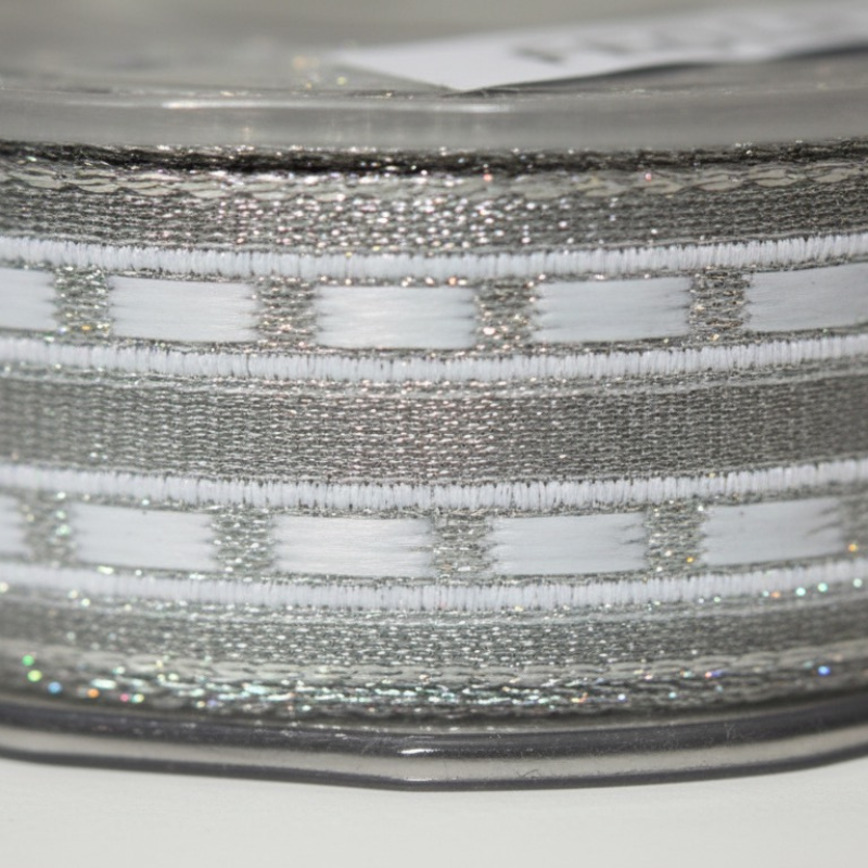 Añade un toque de sofisticación con esta cinta de organza plateada con trazos blancos y bordes alambrados que facilitan el moldeado.