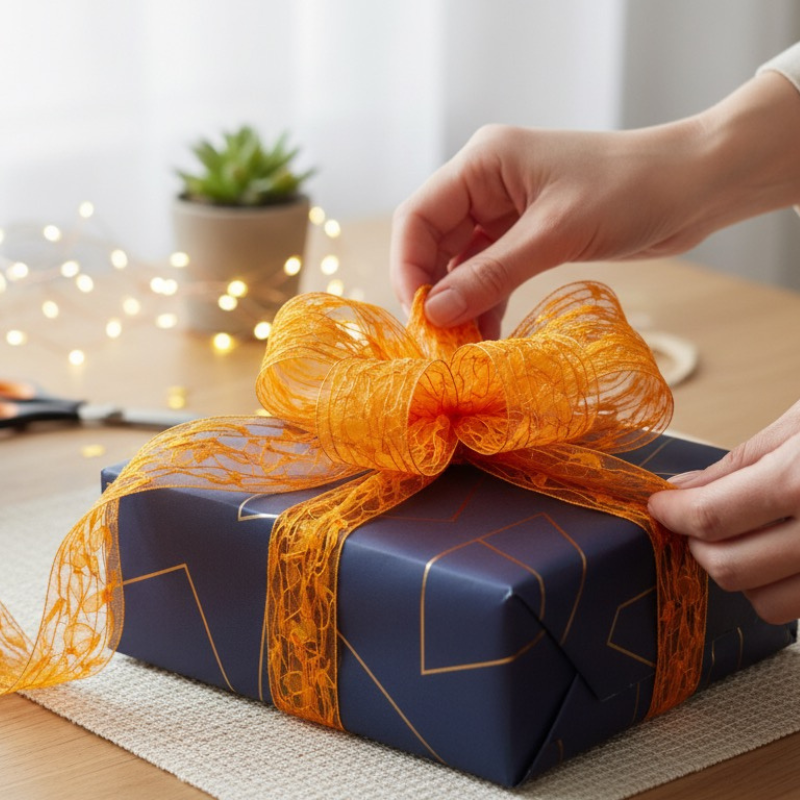 Fita laços de organza na cor laranja, com arame interior que facilita a modelagem, ideal para criar laços elegantes e estruturados.