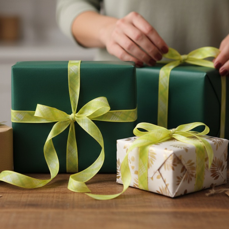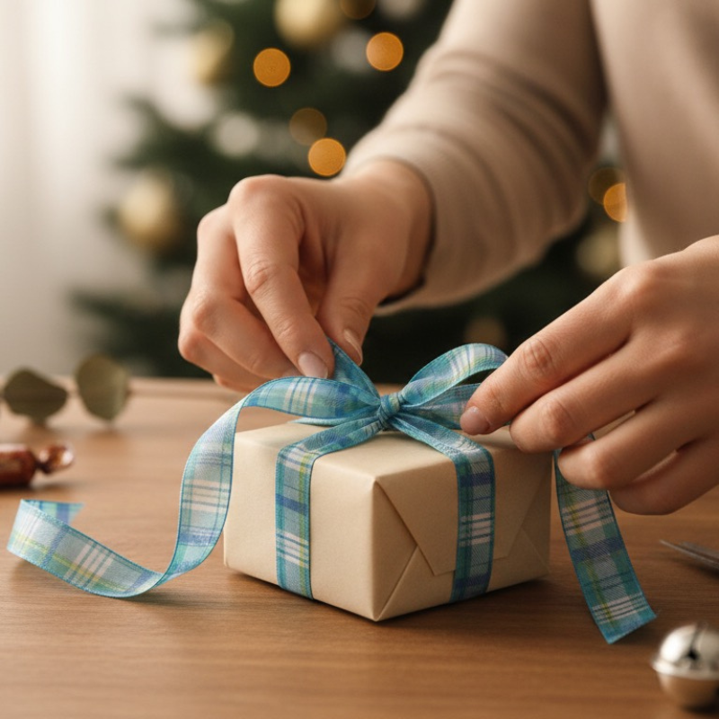 Cinta decorativa con estampado de cuadros para envolver regalos.