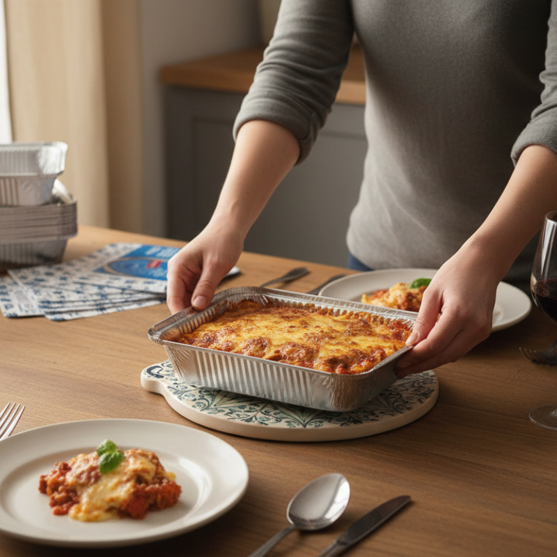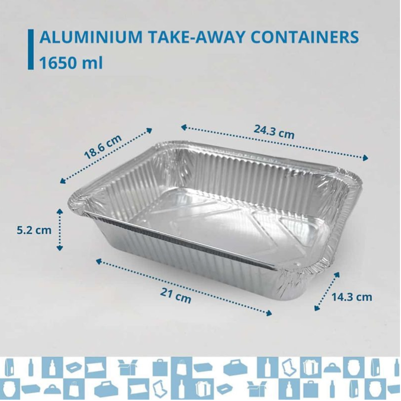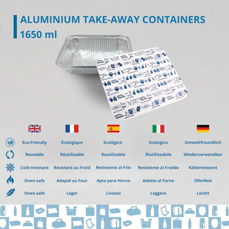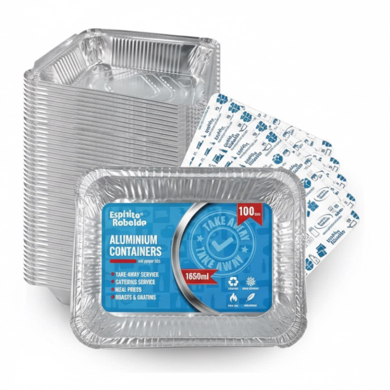 Bandeja de aluminio de 1650ml con tapa incluida, práctica y segura para transportar alimentos.