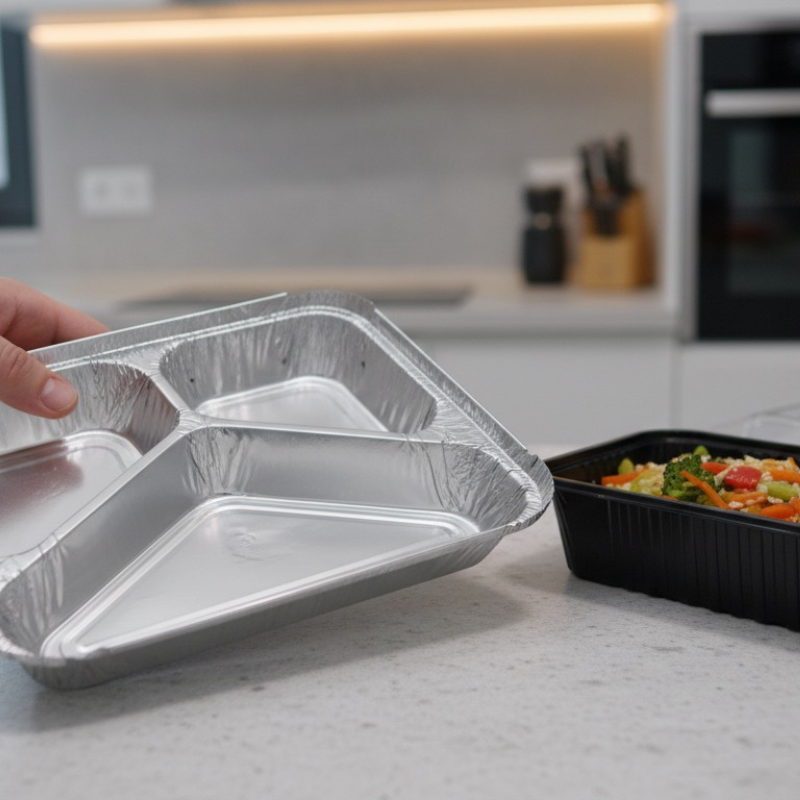 Bandeja de aluminio 360ml/230ml/170ml con triple compartimento, resistente y práctica para comidas separadas.