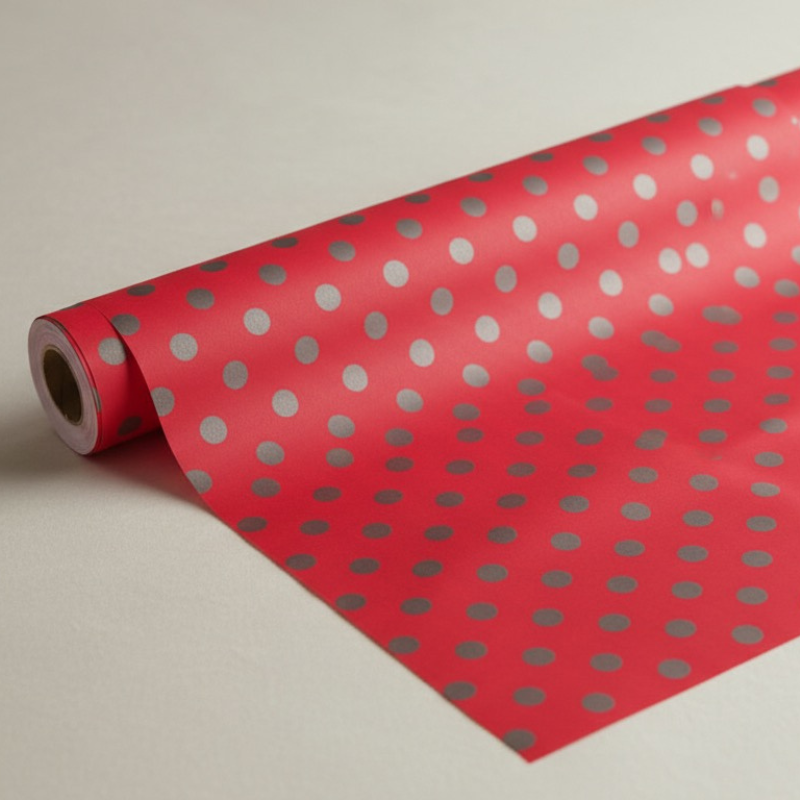 Papel de Regalo Rojo con Puntos Plateados 62cmx90m. ¡Da un toque de elegancia a tus regalos con nuestro Papel de Regalo Rojo con Puntos Plateados 62cmx90m! Perfecto para cualquier ocasión, desde joyas delicadas hasta juguetes grandes. Producto hecho por encargo, con un tiempo de producción de 2 a 5 días laborables.