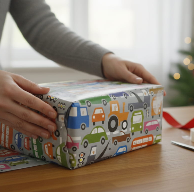 Papel de regalo para niños con estampado de coches. Divertido y colorido para cualquier ocasión especial.