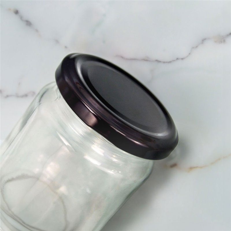 Tapa metálica negra resistente y elegante, disponible en diferentes tamaños para frascos y botellas.