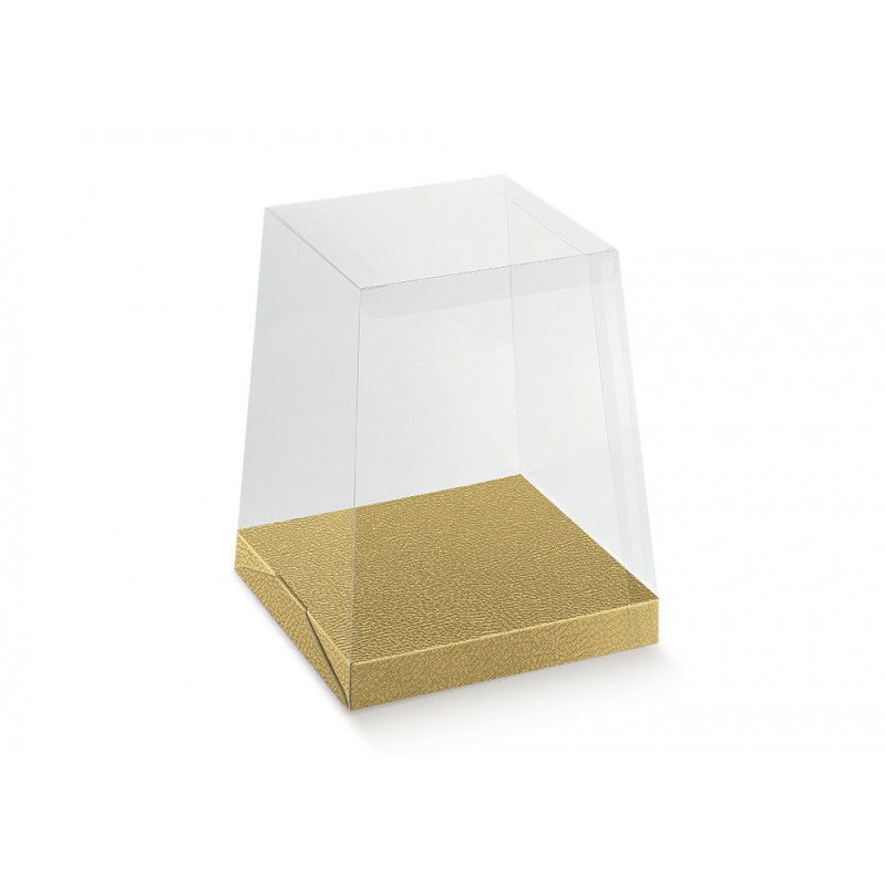 Boîte cadeau - Porte-panettone en PVC avec base dorée 205×205×250 est parfaite pour sublimer les produits gastronomiques. Le corps transparent met en valeur le contenu, et la base en similicuir doré assure un maintien solide et raffiné.