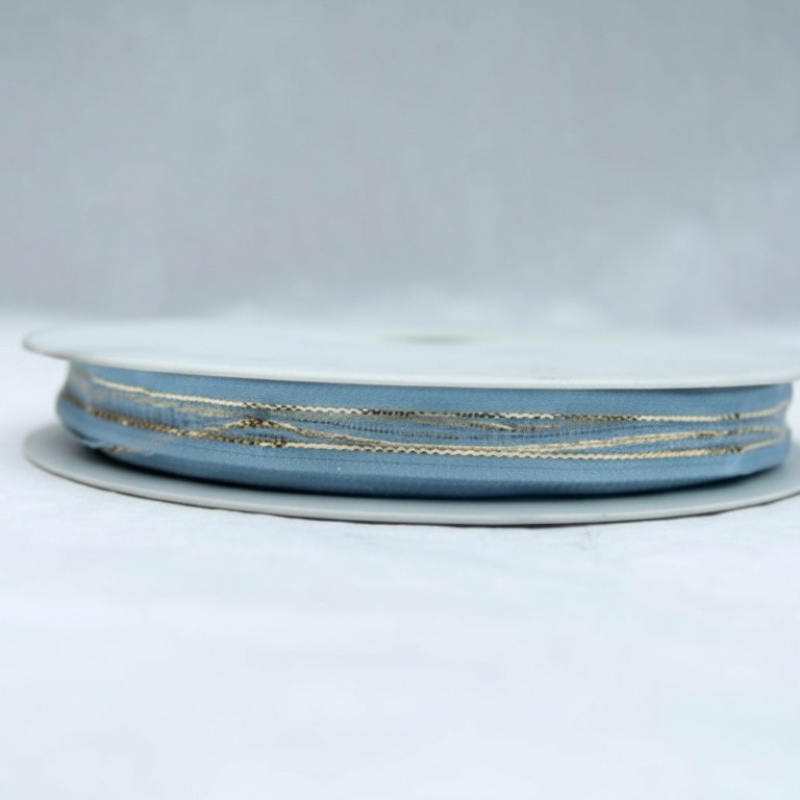 Ruban en organza bleu avec bord doré élégant, parfait pour décorer des cadeaux ou créer des ornements.