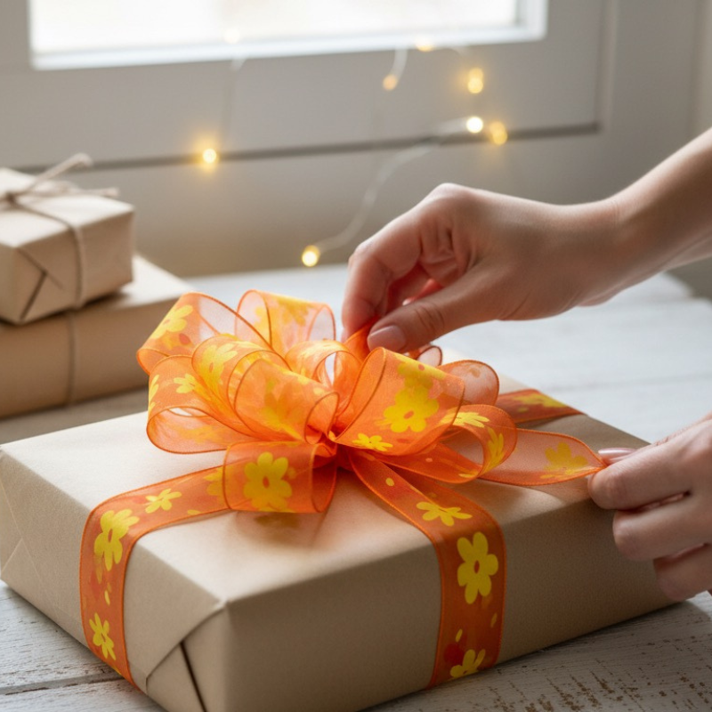 Le ruban en organza orange armé avec fleurs est idéal pour ajouter une touche colorée et élégante à vos décorations, apportant charme et structure.