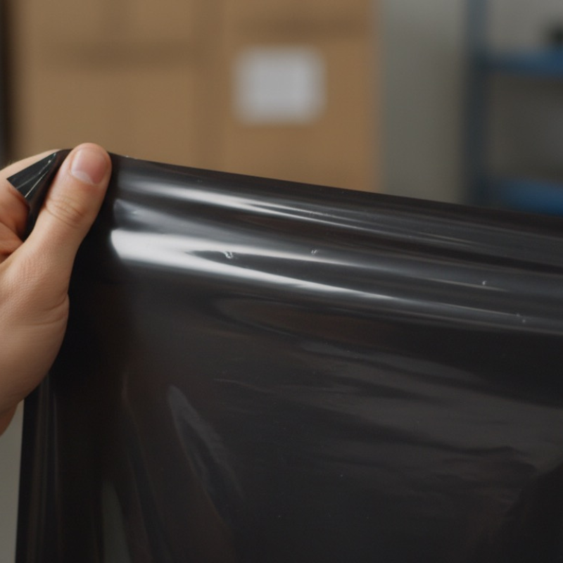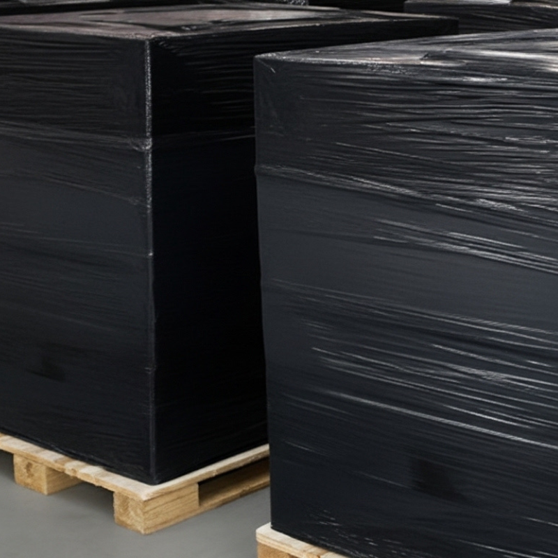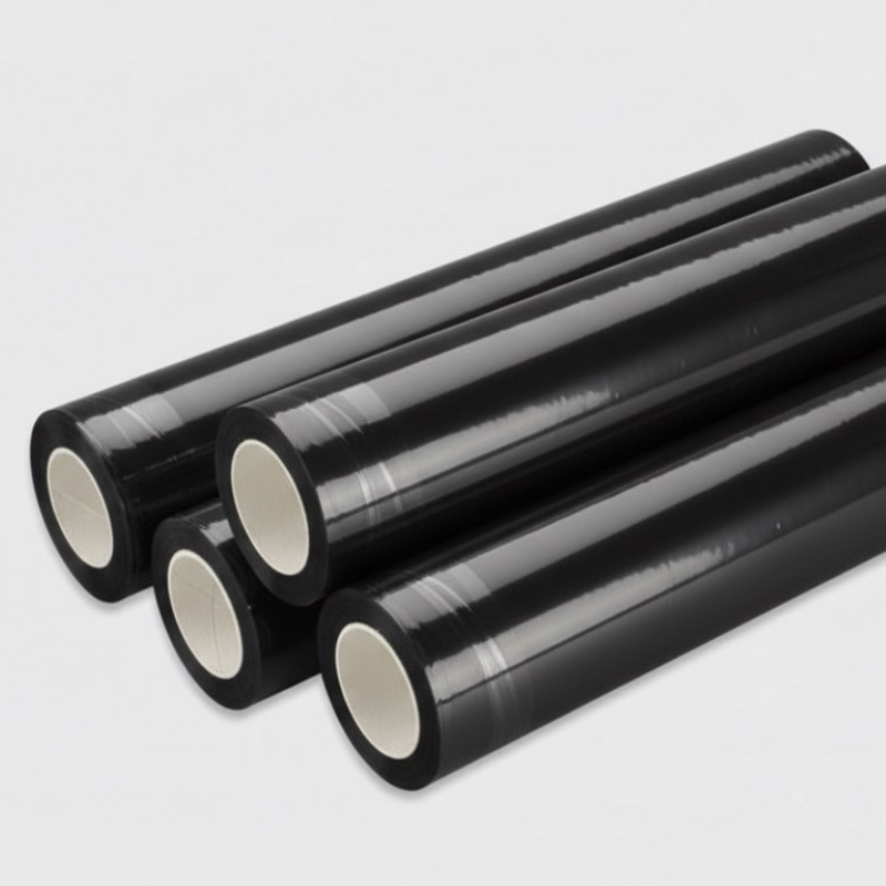 Film étirable noir fourni en rouleaux, idéal pour un emballage rapide et sécurisé de palettes ou produits individuels.