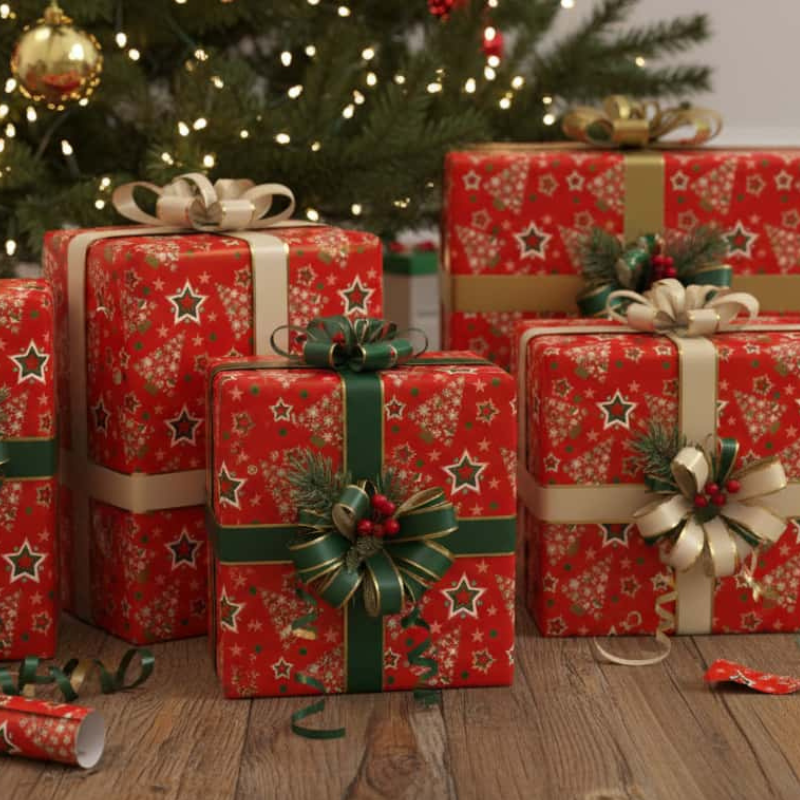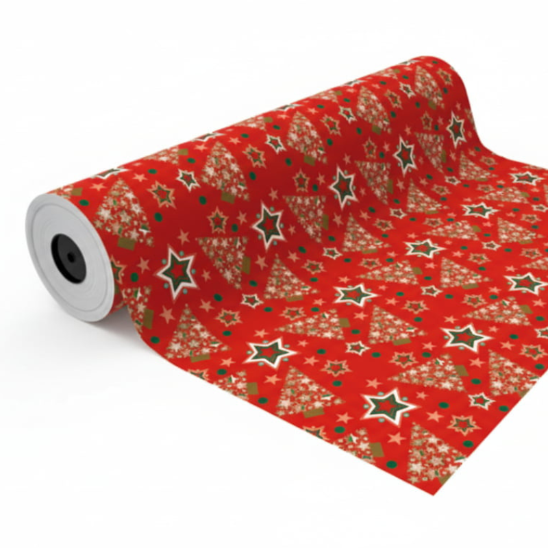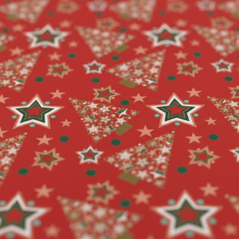 Papier Cadeau Christmas Pine Trees Rouge 62cm x 90m. Un motif festif de sapins verts sur fond rouge, parfait pour les cadeaux de Noël. Dimensions : 62cm x 90m. Expédition immédiate – non sur commande.