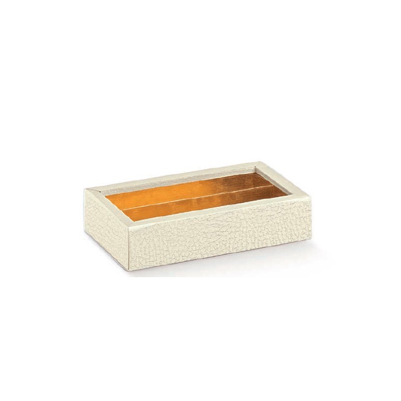 Boîte en acétate transparent avec fond blanc et séparateurs internes. Parfaite pour chocolats et confiseries.
