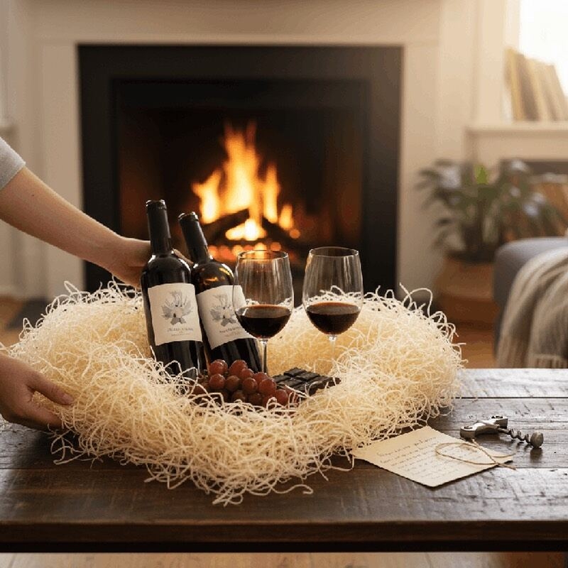 Sublima la presentazione della tua bottiglia con paglia di pino, un dettaglio creativo che eleva qualsiasi occasione.