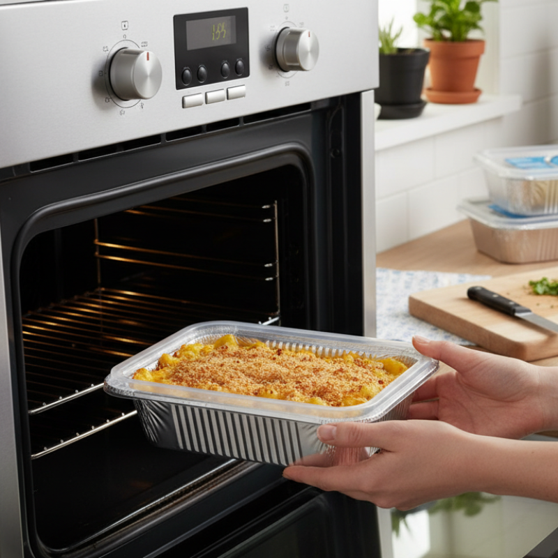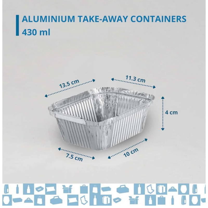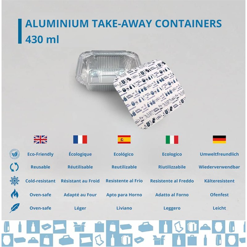 Vaschetta in alluminio da 430ml con coperchio incluso, pratica e sicura per il trasporto di alimenti.