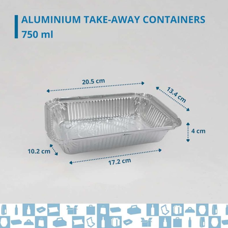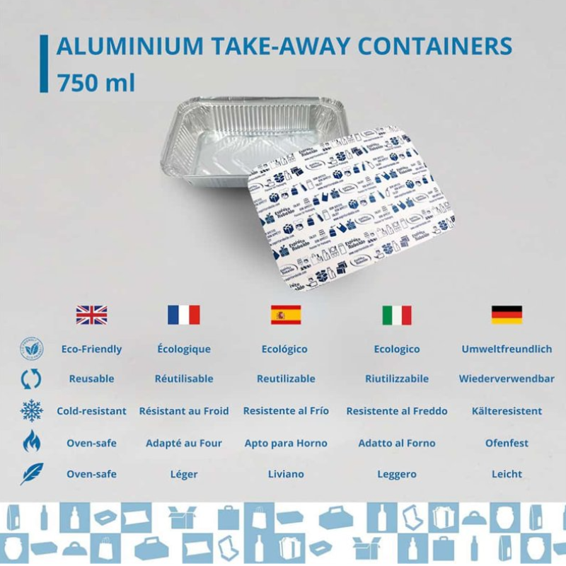 Vaschetta in alluminio da 750ml con coperchio incluso, pratica e sicura per il trasporto di alimenti.