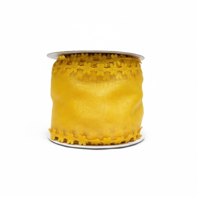Nastro di organza giallo largo con fiori ricamati – perfetto per decorazioni raffinate.