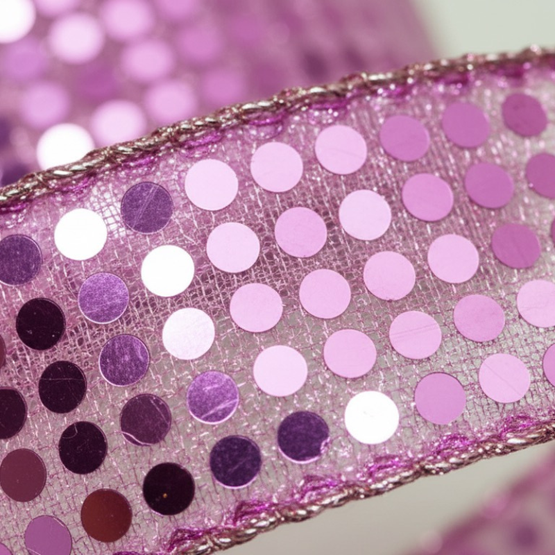 Nastro rosa con paillettes brillanti e bordi wired che conferiscono fascino e struttura, perfetto per progetti creativi e sofisticati.