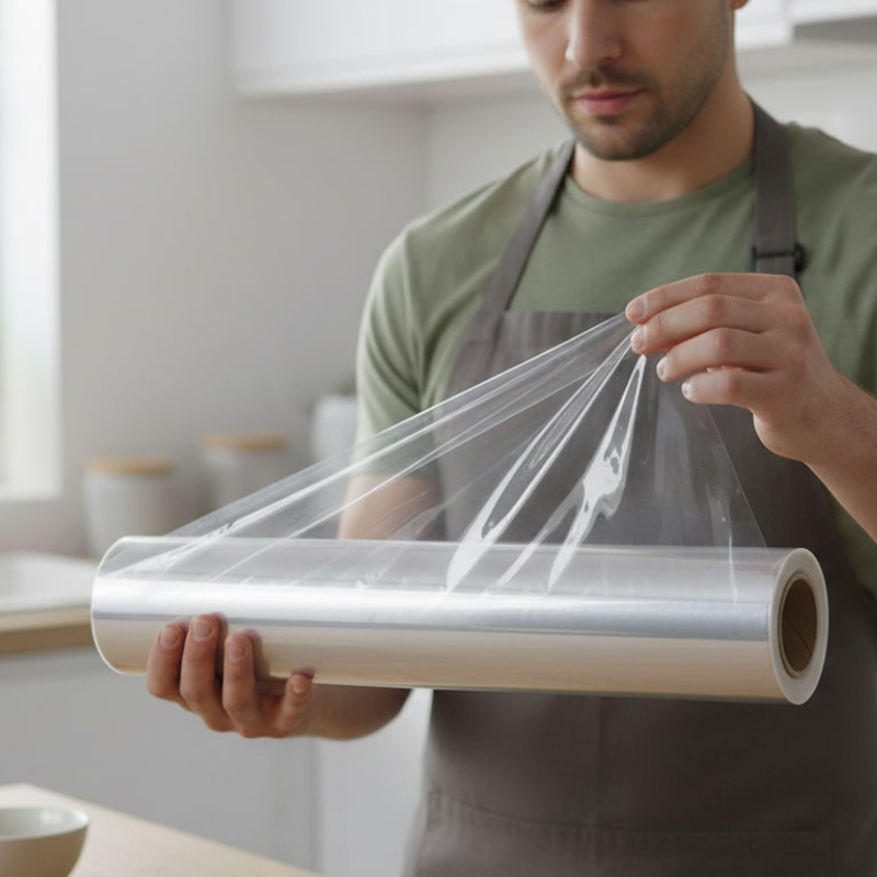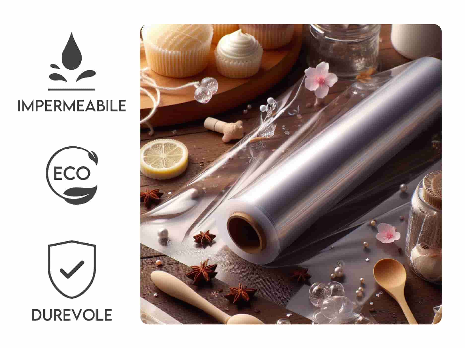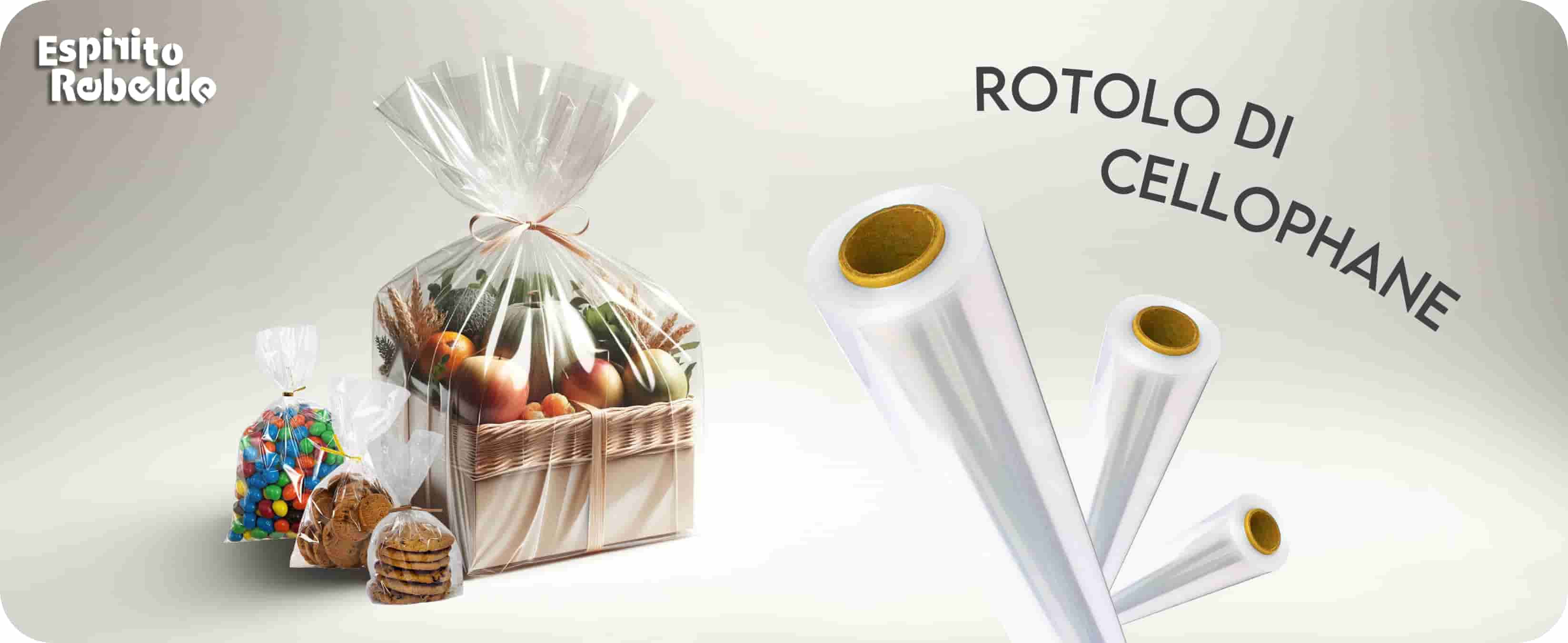 Rotolo di cellophane trasparente per confezioni eleganti e raffinate.