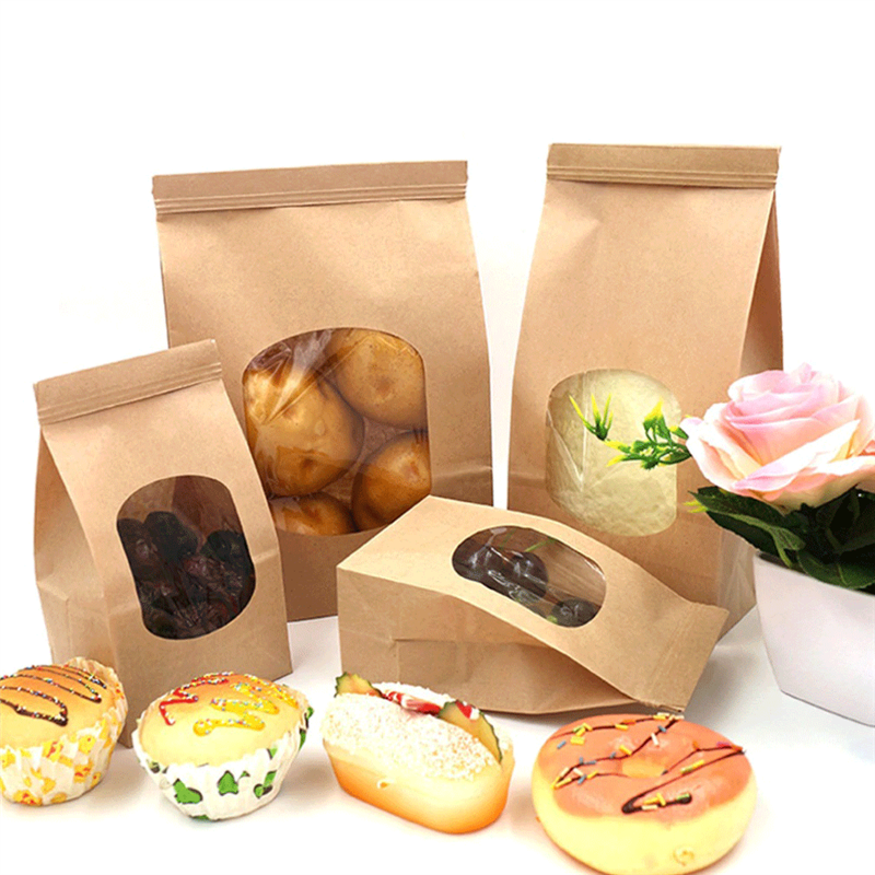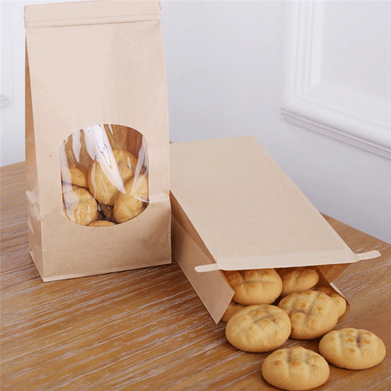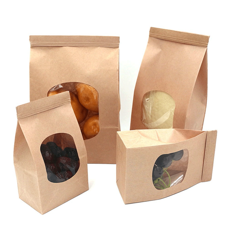 Sacchetti di carta con finestra e chiusura metallica hanno interno in plastica e soffietti laterali e sul fondo che permettono al sacchetto di stare in piedi per una migliore esposizione.