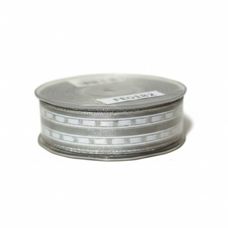 Srebrna taśma organza z białymi akcentami i drucianymi bokami ułatwia formowanie i dodaje elegancji każdej dekoracji.