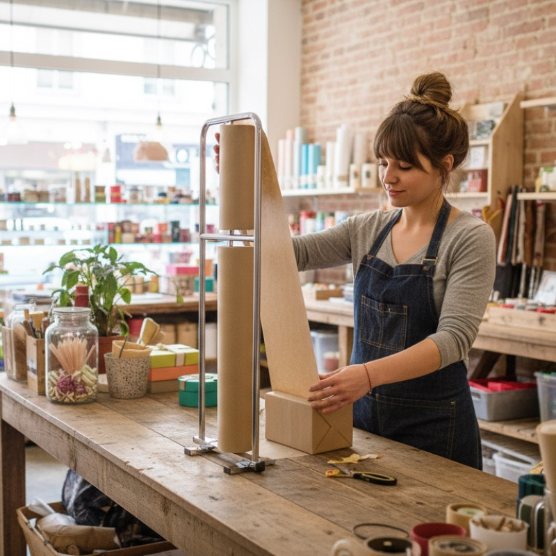 Pionowy podajnik do papieru ozdobnego, idealny do sklepów i punktów usługowych.