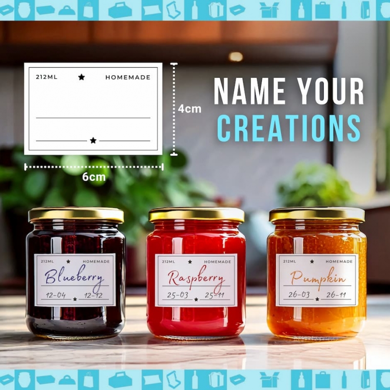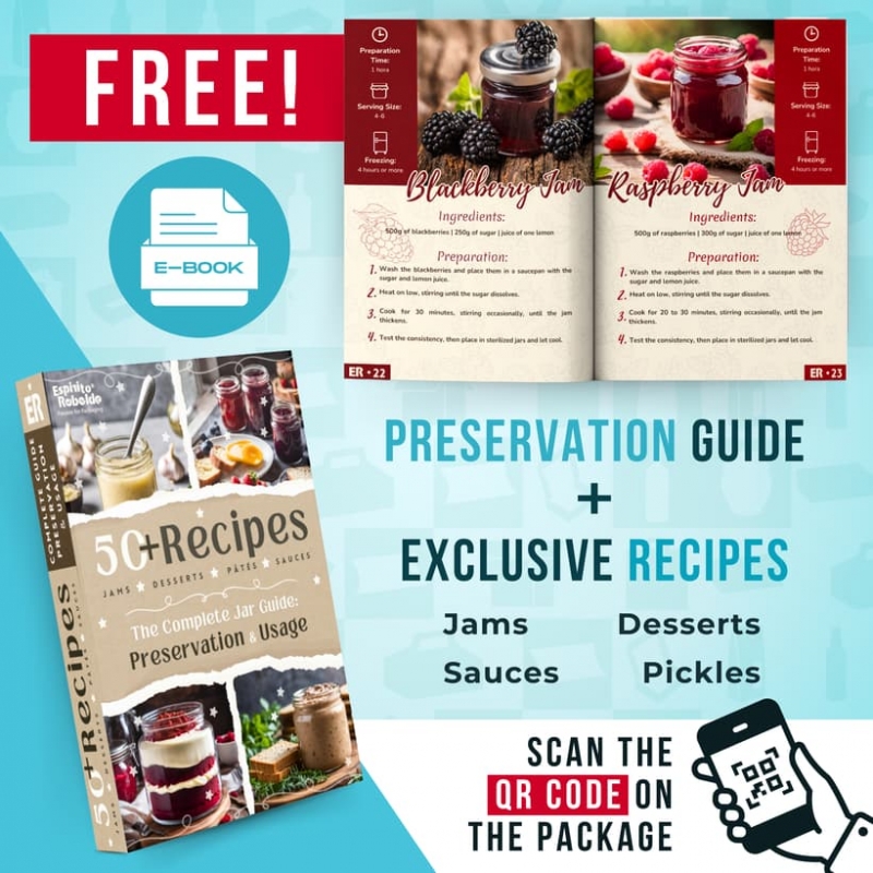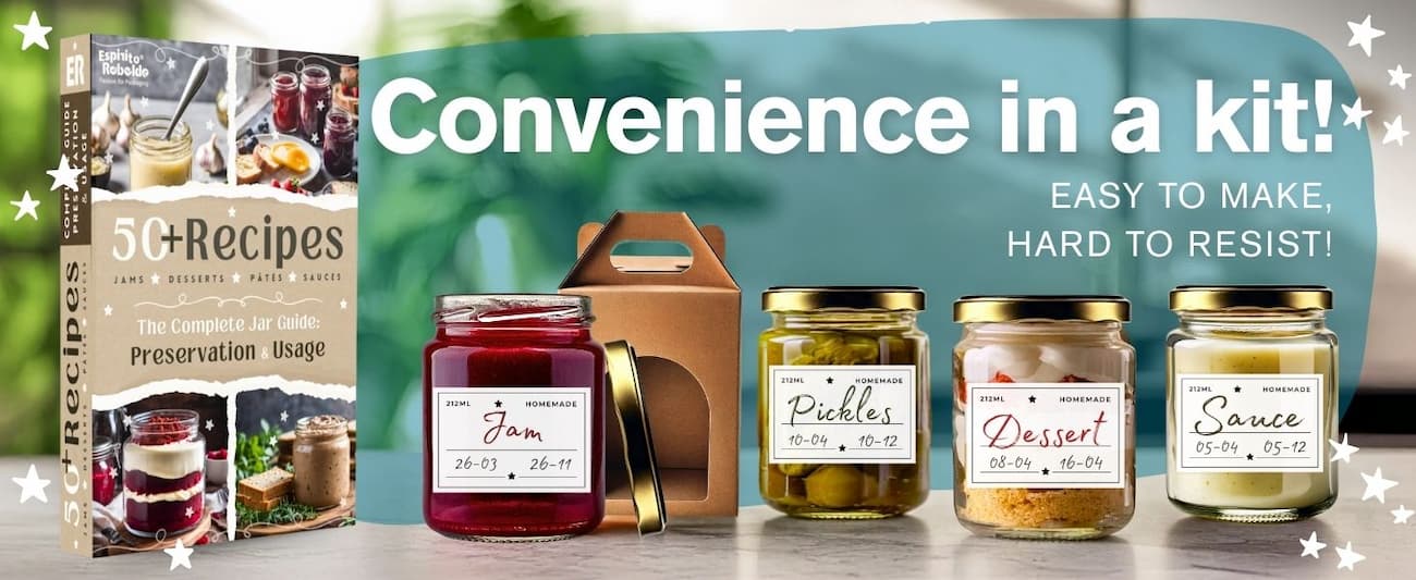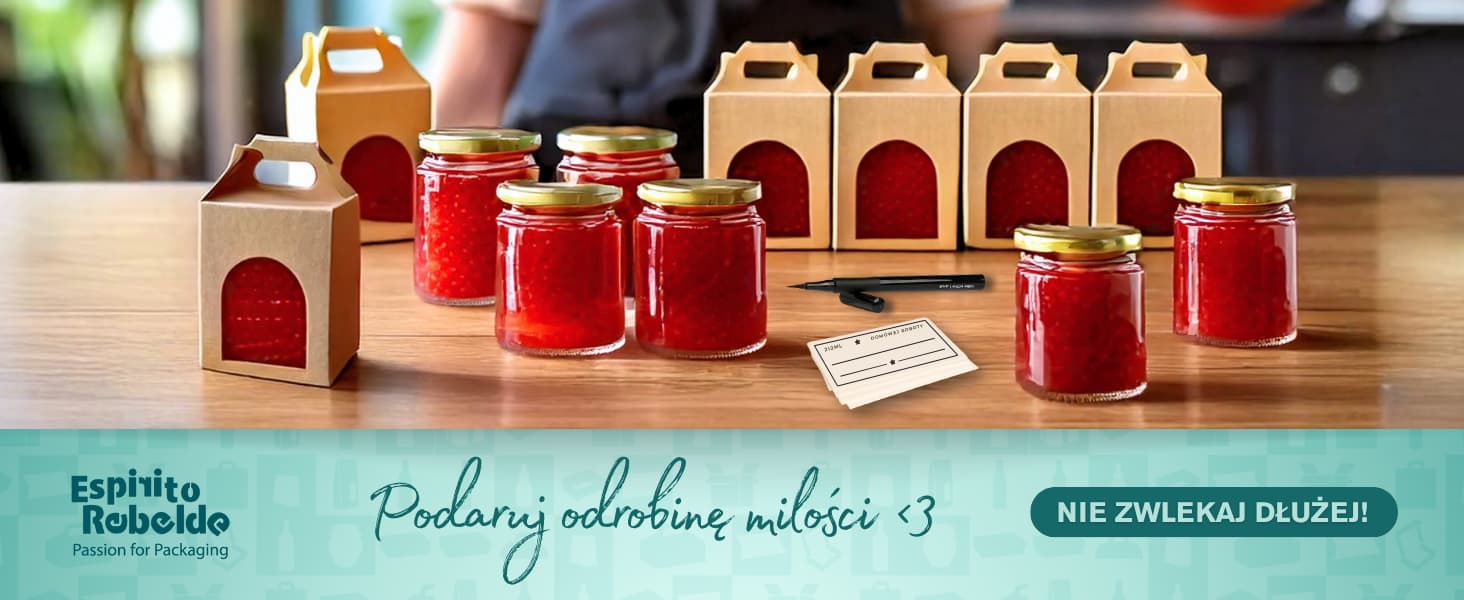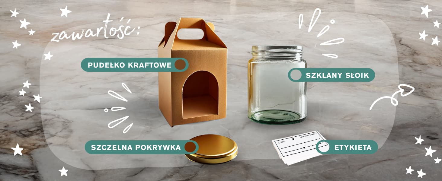 Zestaw 10 słoików szklanych z złotymi pokrywkami, pudełkami kraft i personalizowanymi etykietami. Zawiera DARMOWY E-BOOK z 50+ przepisami na dżemy, sosy i przetwory. E-book do pobrania przez kod QR.