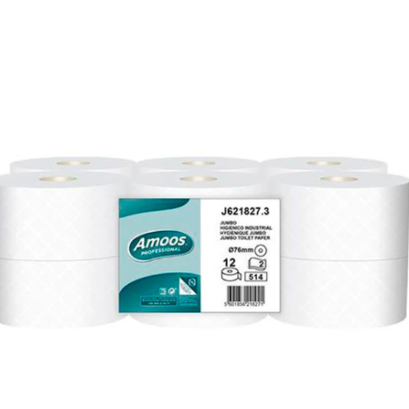 Papier toaletowy jumbo Amoos o długości 90 metrów na rolkę i 12 rolek w opakowaniu do długotrwałego użytku.