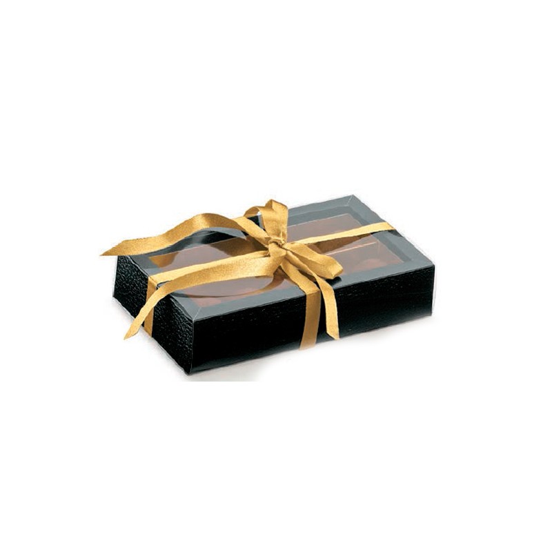 Przezroczyste pudełko z acetatu z czarną podstawą i przegrodami wewnętrznymi. Idealne na praliny i słodycze.