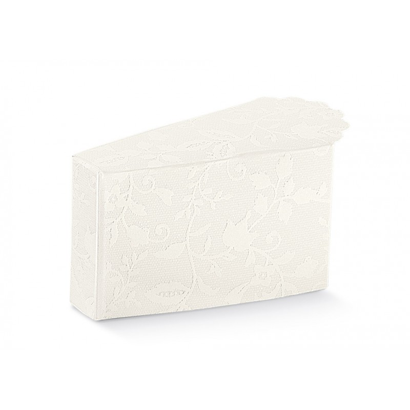 Pudełko prezentowe FETTA TORTA z wykończeniem harmony bianco i ozdobą z koronki. Szykowne i praktyczne, doskonałe na małe prezenty i pamiątki.
