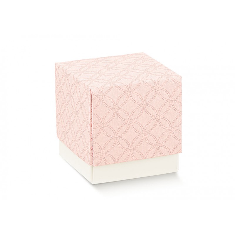 Pudełko prezentowe FLEUR z różowym pikowanym wykończeniem, bez okienka. Wymiary: 70x70x70mm. Doskonałe na biżuterię lub drobne upominki.