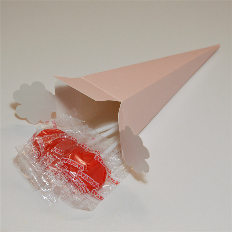 Pudełko na prezent – Cono Quad. Satin Cipria z delikatnym różowym połyskiem i formą stożka. Zamykane poprzez zawiązanie wstążki na górze (wstążka nie dołączona). Idealne na małe prezenty, słodycze lub eleganckie upominki okolicznościowe.