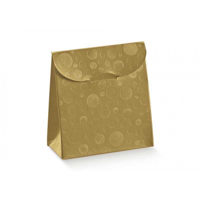 Pudełko na prezent - SACCHET. 90X45X130 SFERE ORO wykonane z trwałego kartonu o błyszczącym, złotym wykończeniu. Idealne na słodycze, biżuterię, mini prezenty i produkty rzemieślnicze. Jego pionowa forma dodaje klasy każdej prezentacji.