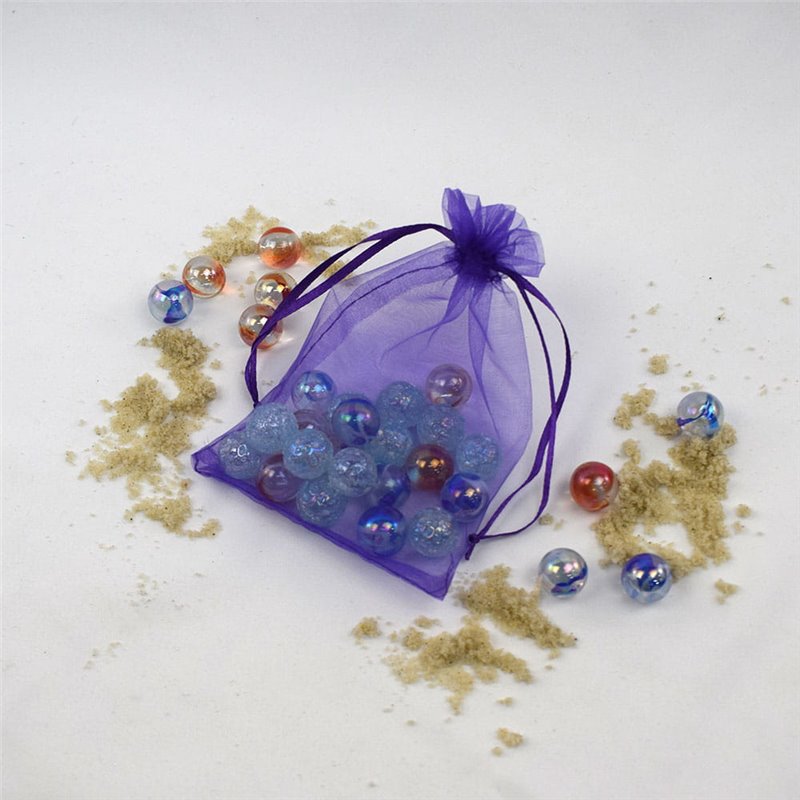 Wykonany z półprzezroczystej organzy, subtelnie eksponuje zawartość i dodaje jej uroku.
