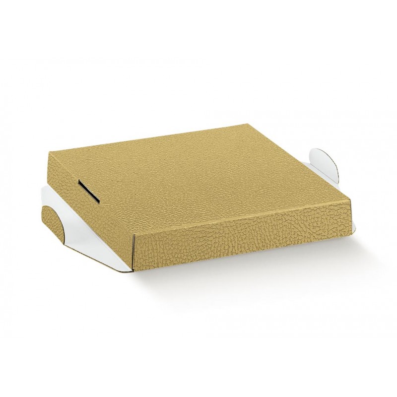 Fundo rígido para estojo com acabamento em pele ecológica dourada. Ideal como base para pequenos objetos, combinando elegância e resistência.