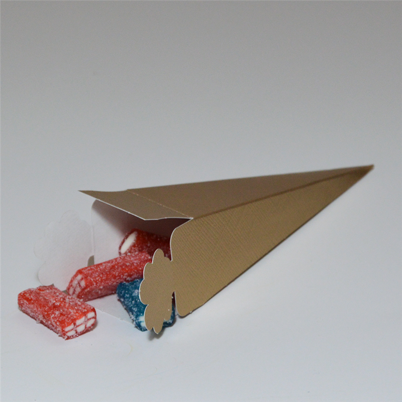 Caixa para brinde - Cono Quad.155 SETA ORO possui formato elegante em cone quadrado com topo ajustável por fita, proporcionando um toque especial a lembranças, bombons ou artigos pequenos. Ideal para confeitaria artesanal, brindes personalizados ou eventos. Disponível em várias cores e tamanhos.