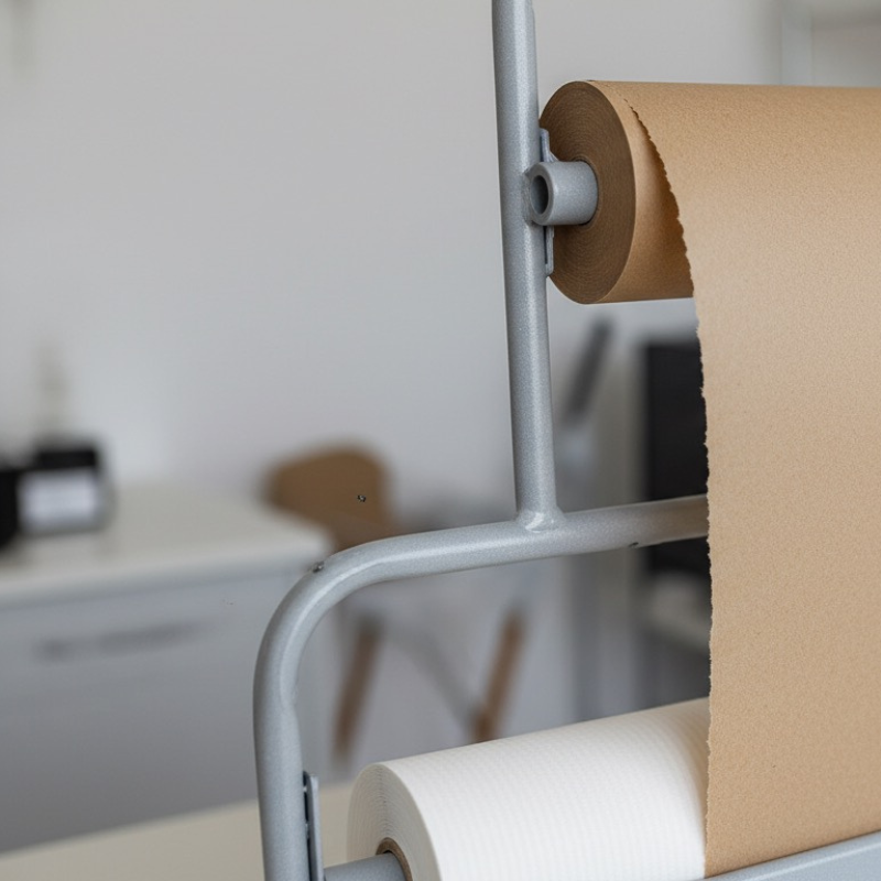 Desenrolador de papel de embrulho com dois suportes: um de 70cm e outro de 35cm, ideal para agilizar o processo de embalagem.